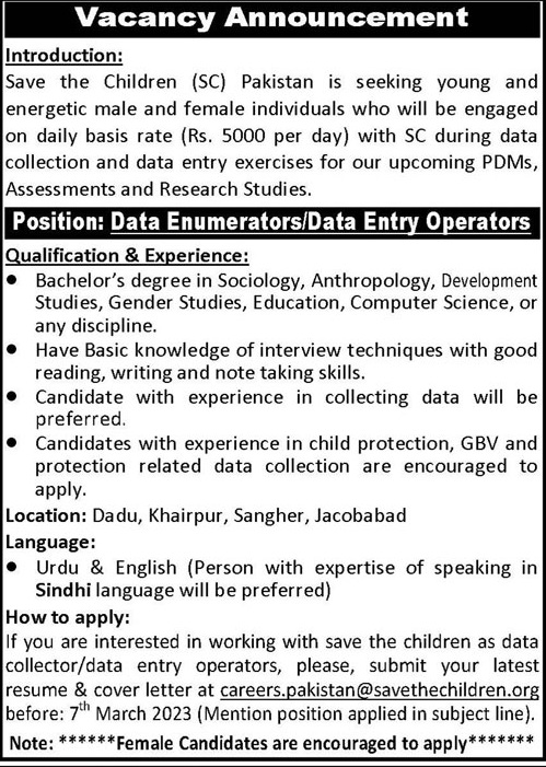 Vacant posts including data enumerators and data entry operator are announced in Save the Children Dadu, dadu, sanghar, jacobabad and khairpur Sindh Pakistan as per 3 March 2023 advertisement in daily Kawish Newspaper. Candidates with Bachelor etc. educational background will be preferred.
