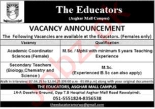 Vacant posts including academic coordinator science and secondary teachers are announced in The Educators Asghar Mall Road Rawalpindi, rawalpindi Punjab Pakistan as per 7 April 2025 advertisement in daily Jang Newspaper. Persons with M.sc, Master, Mphil and Bachelor etc. education can apply.