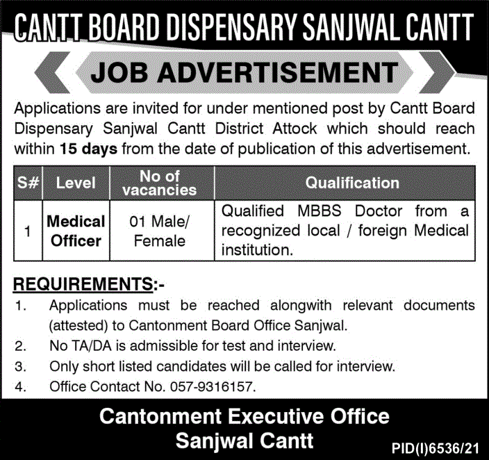 Cantt Board Dispensary jobs advertisement dated about 18 March 2022 in daily Ausaf Newspaper invites application for the vacant post of medical officer in Attock, attock Punjab Pakistan. Educational qualifications required MBBS etc.