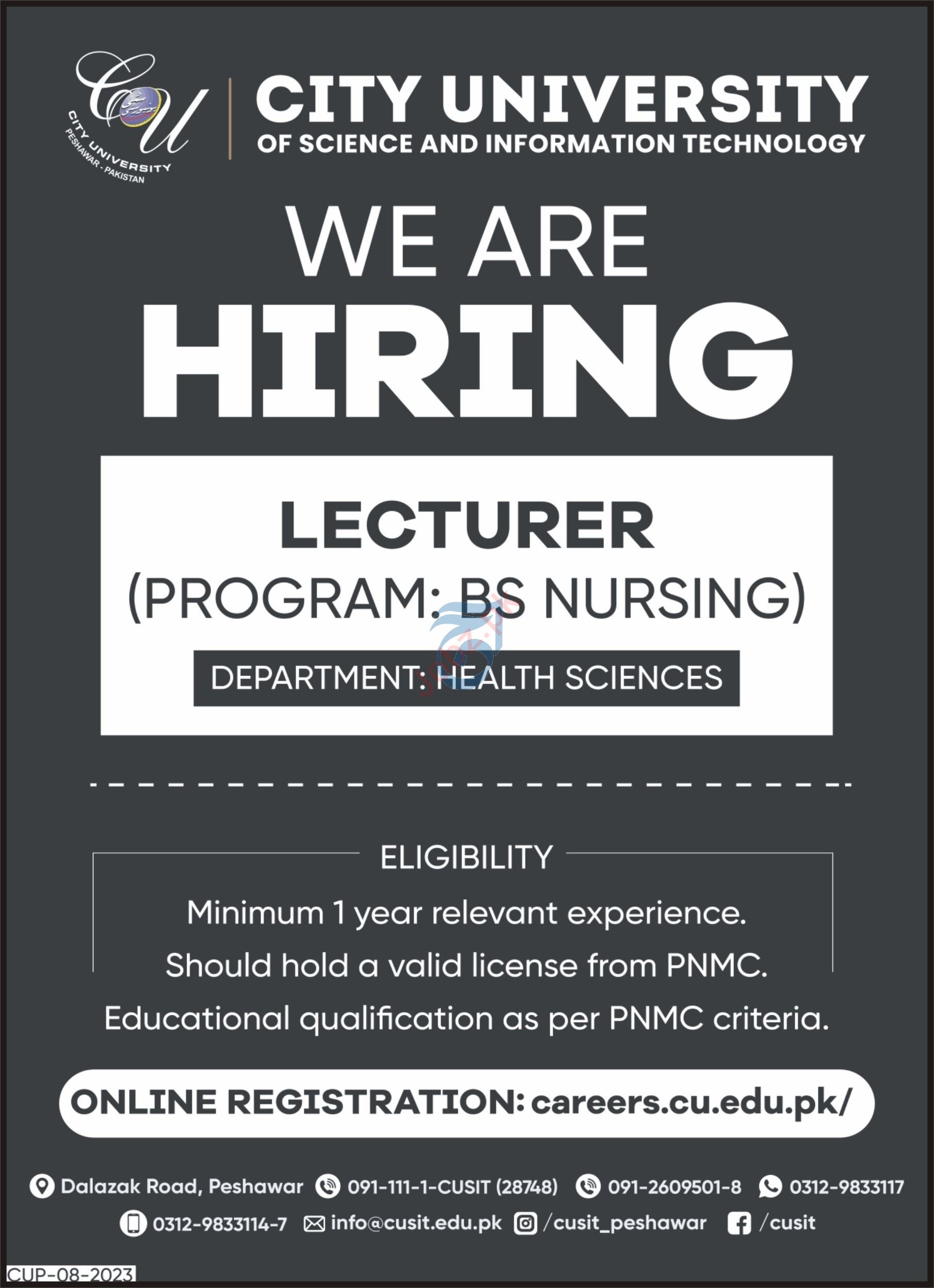 City University of Science & Information Technology CUSIT Peshawar, peshawar Khyber Pakhtunkhwa KPK Pakistan invites applications from eligible candidates for the post of lecturer nursing as per advertisement of October 22, 2023 published in daily Aaj Newspaper. Candidates with etc. educational background will be preferred.