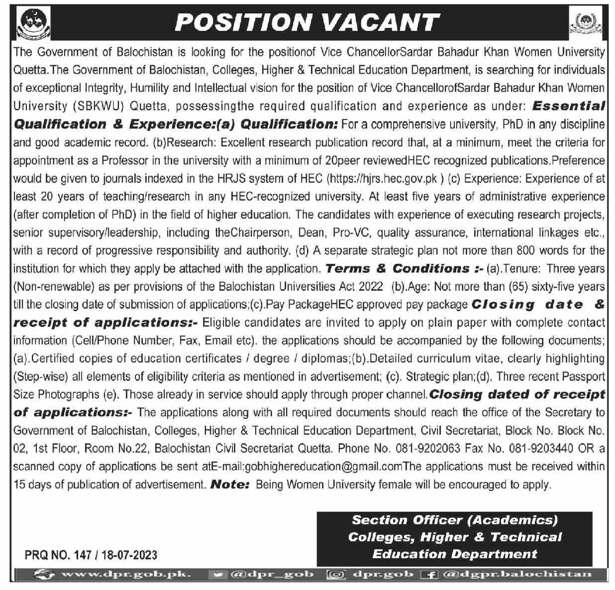 The Colleges Higher and Technical Education Department jobs advertisement dated about 20 July 2023 in daily Dawn Newspaper invites application for the vacant post of vice chancellor in Quetta, quetta Balochistan Pakistan. Phd etc. educational qualification will be preferred.