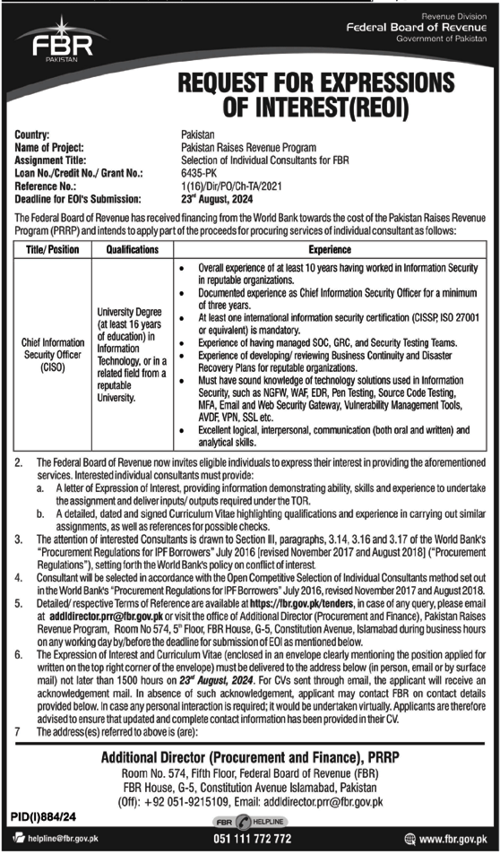 Federal Board of Revenue FBR Islamabad, islamabad Islamabad Pakistan invites applications from eligible candidates for the post of chief information security officer as per advertisement of August 7, 2024 published in daily Nawaiwaqt Newspaper. Candidates with Bachelor and Master etc. educational background will be preferred.