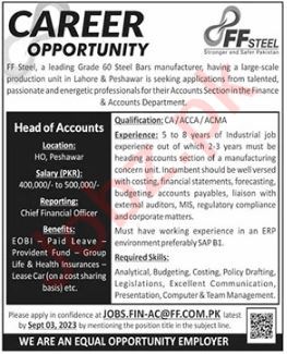 FF Steel Manufacturing Industry Peshawar, peshawar Khyber Pakhtunkhwa KPK Pakistan invites applications from eligible candidates for the post of head of accounts as per advertisement of August 27, 2023 published in daily The News Newspaper. Candidates with CA and ACCA etc. educational background will be preferred.