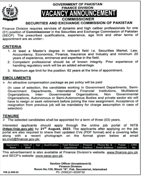 Finance Division jobs advertisement dated about 6 August 2023 in daily Jang Newspaper invites application for the vacant post of commissioner in Islamabad, islamabad Islamabad Pakistan. Candidates with MS and Master etc. educational background will be preferred.