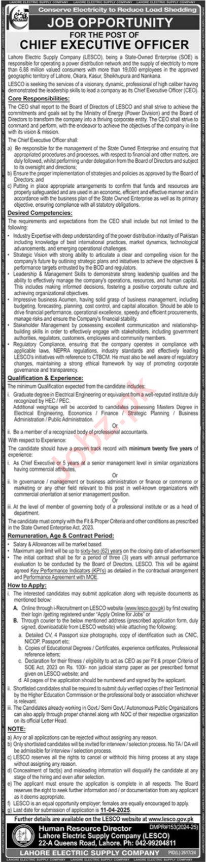 Lahore Electric Supply Company LESCO Queens Road Lahore, lahore Punjab Pakistan invites applications from eligible candidates for the post of chief executive officer as per advertisement of March 23, 2025 published in daily The News Newspaper. Preferred Education is Bachelor and Master etc.