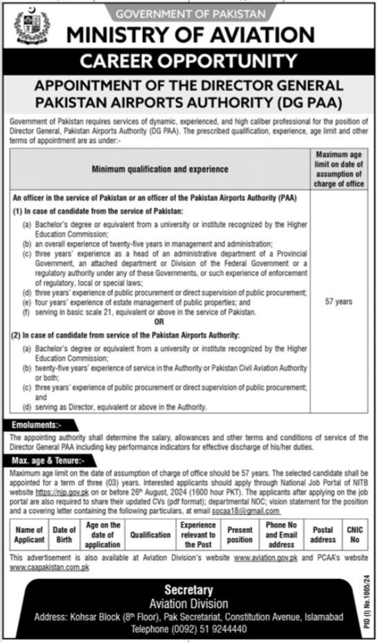 Ministry of Aviation Islamabad, islamabad Islamabad Pakistan invites applications from eligible candidates for the post of director general as per advertisement of August 10, 2024 published in daily Jang Newspaper. Preferred Education is Master and Bachelor etc.