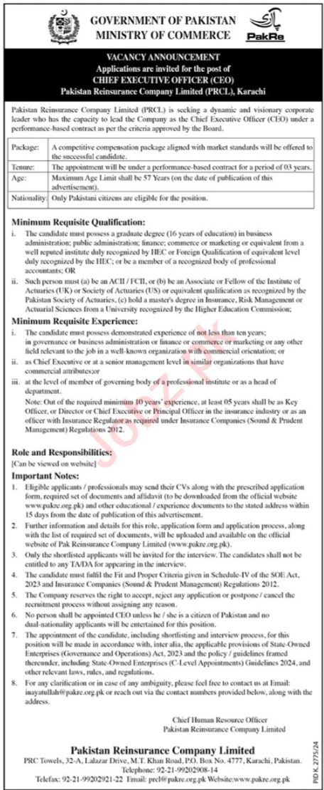 Ministry of Commerce Karachi, karachi Sindh Pakistan invites applications from eligible candidates for the post of chief executive officer as per advertisement of March 9, 2025 published in daily The News Newspaper. Candidates with Bachelor and Master etc. educational background will be preferred.