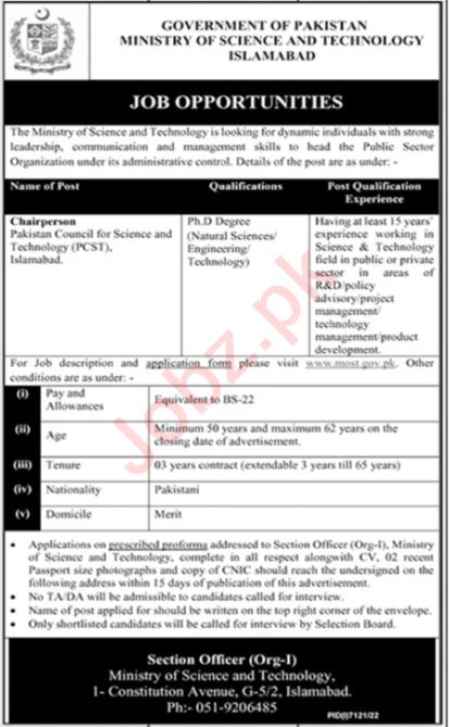 Ministry of Science and Technology MOST Islamabad, islamabad Islamabad Pakistan invites applications from eligible candidates for the post of chairperson as per advertisement of May 21, 2023 published in daily Jang Newspaper. Preferred Education is Phd etc.