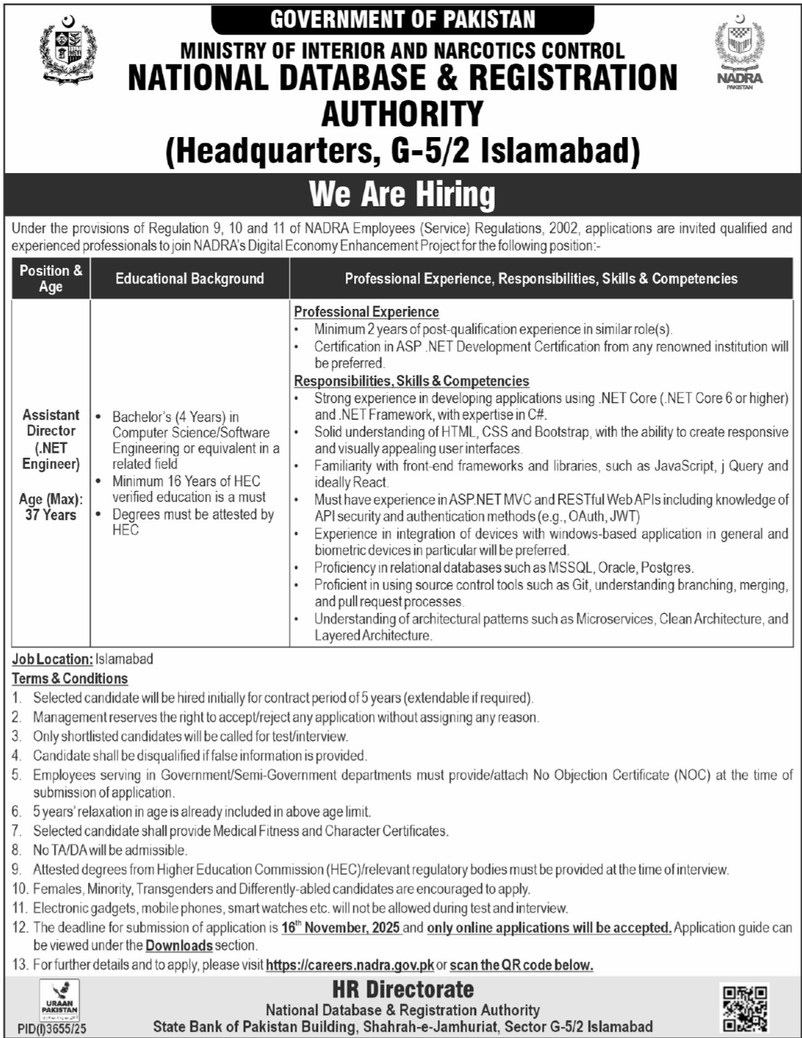 National Database & Registration Authority NADRA G-5 Islamabad, islamabad Islamabad Pakistan invites applications from eligible candidates for the post of dot net engineer and assistant director as per advertisement of November 3, 2025 published in daily Express Tribune Newspaper. Persons with BIT, BCS and Bachelor etc. education can apply.