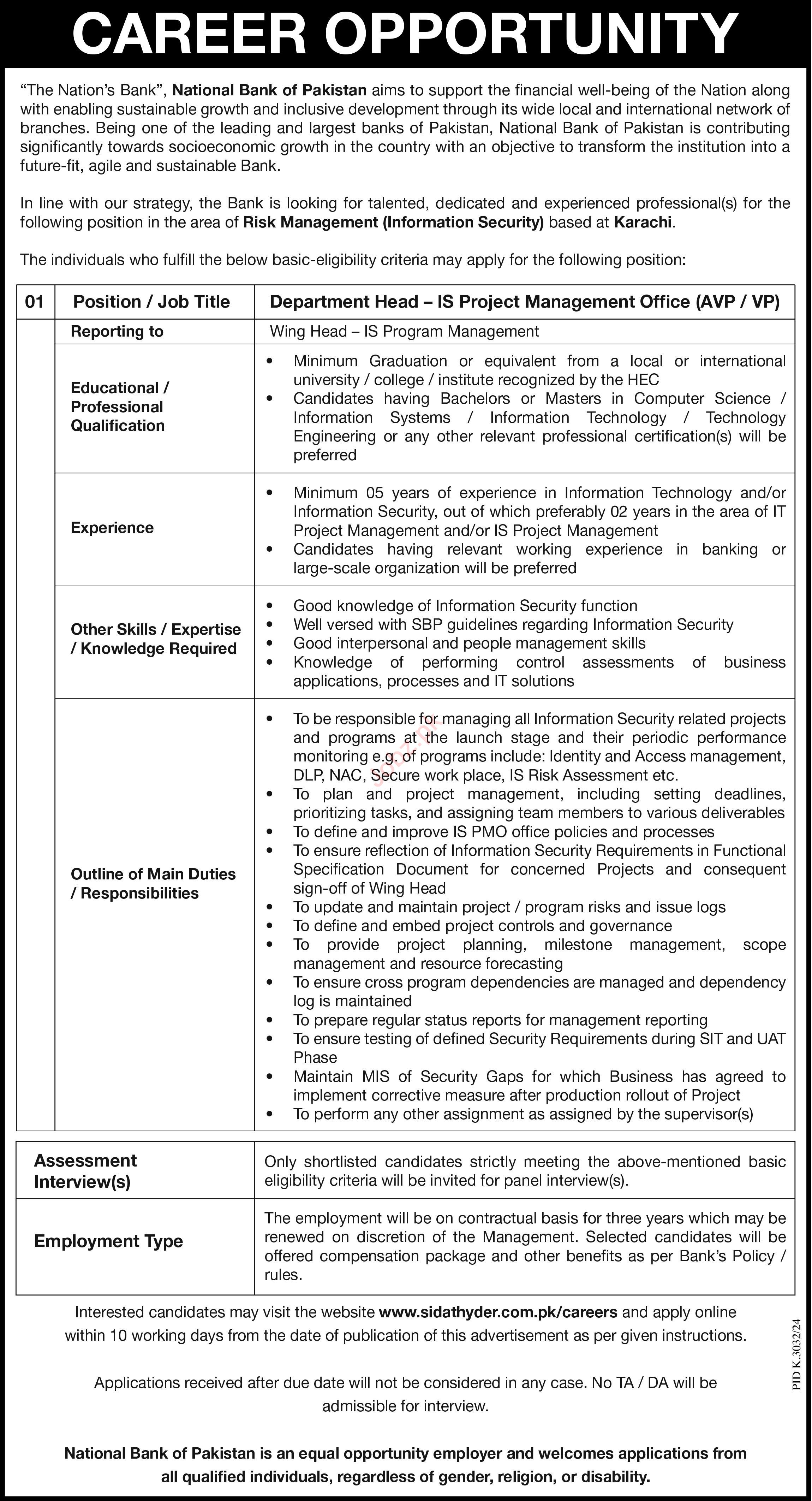 National Bank of Pakistan NBP is looking for candidates for following posts as per job advertisement published in daily Other Newspaper of April 6, 2025 for location Karachi, karachi Sindh Pakistan: