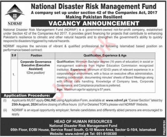 Vacant posts including corporate governance executive and executive assistant are announced in National Disaster Risk Management Fund NDRMF Islamabad, islamabad Islamabad Pakistan as per 13 August 2024 advertisement in daily Jang Newspaper. Persons with Bachelor etc. education can apply.