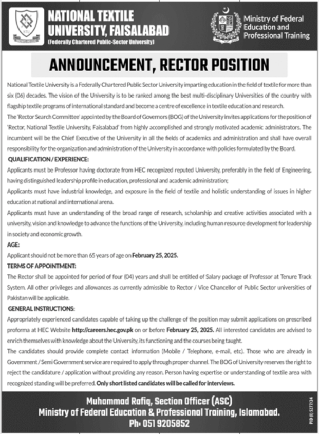 National Textile University Faisalabad, faisalabad Punjab Pakistan invites applications from eligible candidates for the post of rector as per advertisement of February 3, 2025 published in daily Jang Newspaper. Preferred Education is Bachelor, Master and Phd etc.