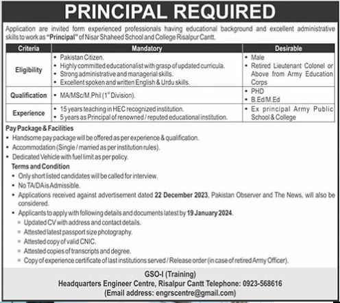 Vacant posts including principal are announced in Nisar Shaheed School & College Risalpur, risalpur Khyber Pakhtunkhwa KPK Pakistan as per 9 January 2024 advertisement in daily The News Newspaper. MA, B.ed, M.sc, M.ed, Mphil and Phd etc. educational qualification will be preferred.
