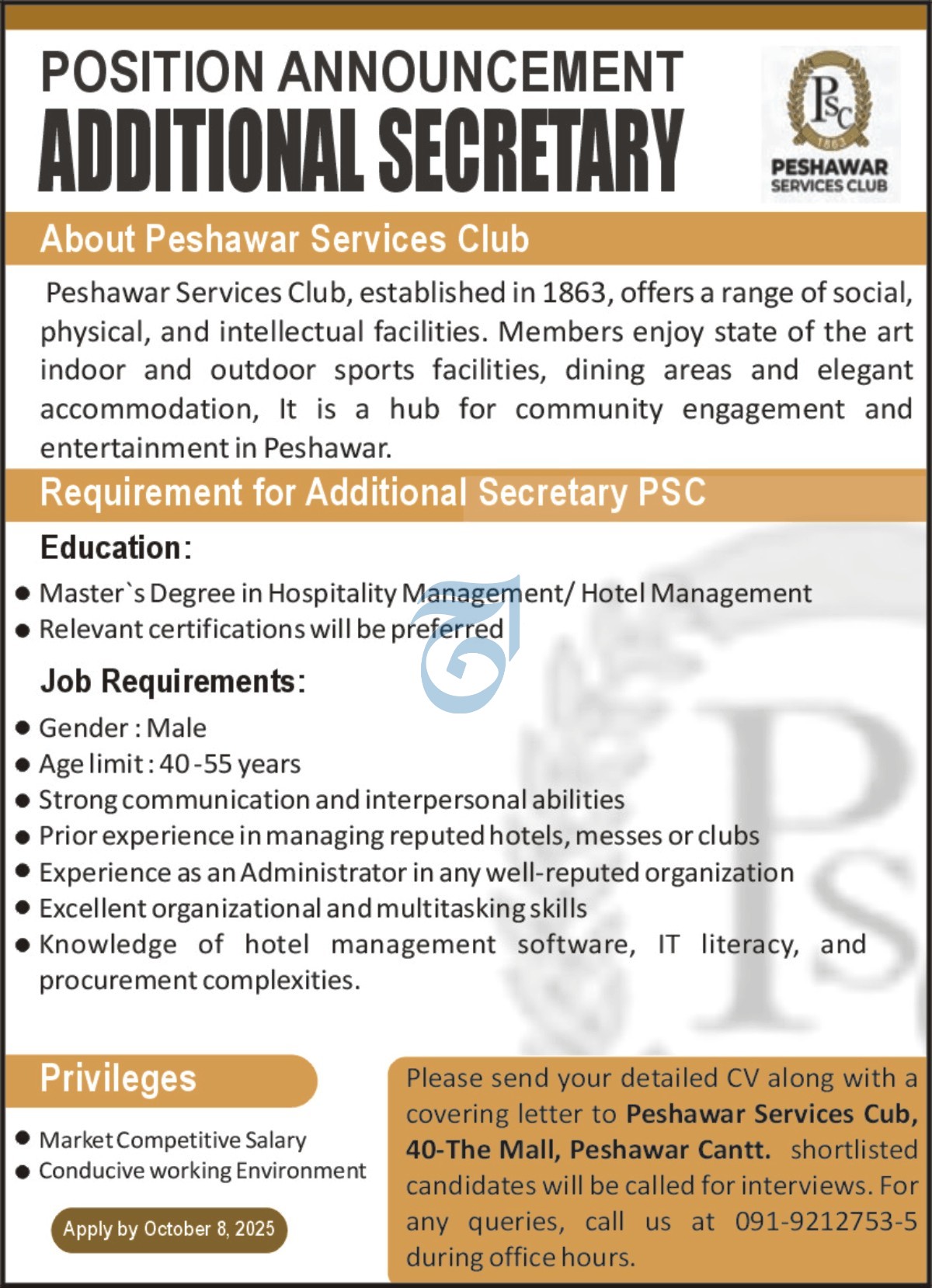 Latest Government jobs in Peshawar Services Club in Secretarial and others can be applied till 8 October 2025 or as per closing date in newspaper ad. Read complete ad online to know how to apply on latest Peshawar Services Club job opportunities.