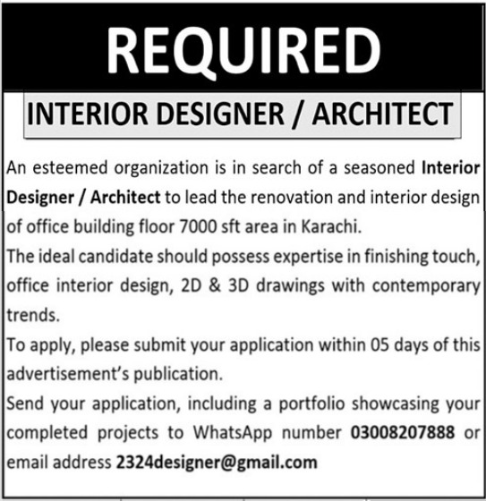 Private Organization Karachi, karachi Sindh Pakistan invites applications from eligible candidates for the post of architect and interior designer as per advertisement of January 06, 2024 published in daily Jang Newspaper. Persons with Master and Bachelor etc. education can apply.