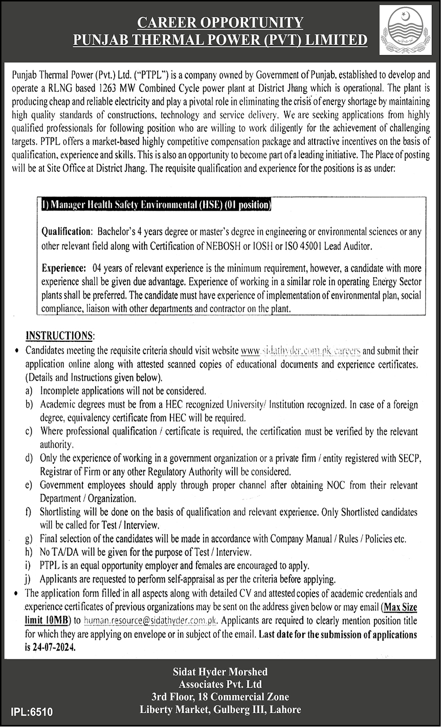 Vacant posts including manager health safety enivronmental are announced in Punjab Thermal Power Private Limited Lahore, lahore Punjab Pakistan as per 12 July 2024 advertisement in daily Other Newspaper. Candidates with Master and Bachelor etc. educational background will be preferred.
