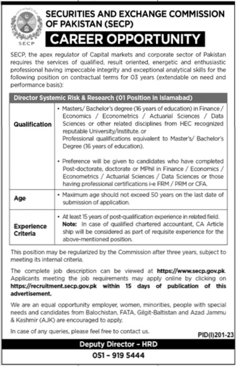 Securities and Exchange Commission of Pakistan jobs advertisement dated about 12 July 2023 in daily Jang Newspaper invites application for the vacant post of director systemic risk research in Islamabad, islamabad Islamabad Pakistan. Candidates with Master and Bachelor etc. educational background will be preferred.