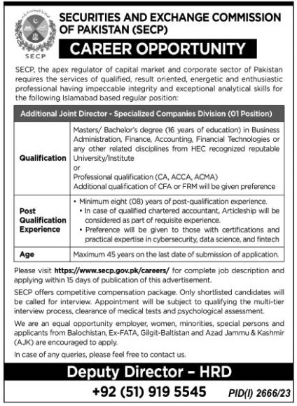Securities and Exchange Commission of Pakistan jobs advertisement dated about 3 November 2023 in daily Nation Newspaper invites application for the vacant post of additional joint director in Islamabad, islamabad Islamabad Pakistan. Preferred Education is ACCA, Bachelor, Master and CA etc.