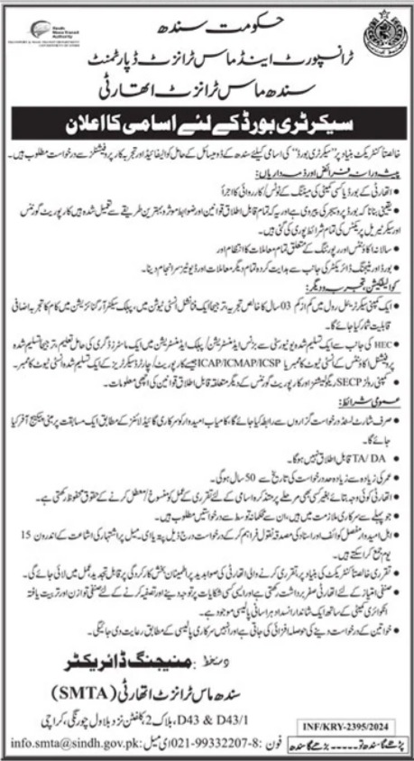 Latest Transport & Mass Transit Department Secretarial Posts Karachi 2025
