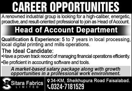 Sitara Fabrics Ltd Faisalabad, faisalabad Punjab Pakistan invites applications from eligible candidates for the post of head of account department as per advertisement of November 20, 2024 published in daily Express Newspaper. Preferred Education is Bachelor and Master etc.