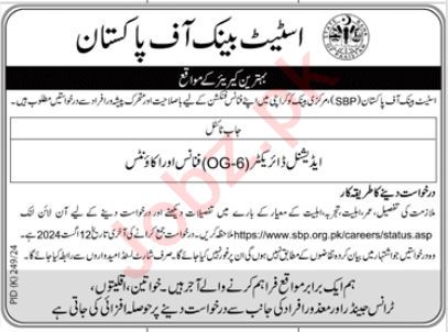 State Bank of Pakistan SBP Karachi, karachi Sindh Pakistan invites applications from eligible candidates for the post of additional director finance accounts as per advertisement of July 28, 2024 published in daily Jang Newspaper. Persons with Master and Bachelor etc. education can apply.