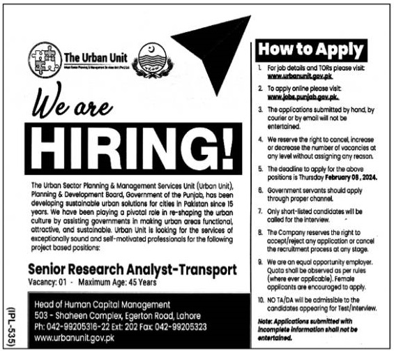 The Urban Unit jobs advertisement dated about 19 January 2024 in daily Nation Newspaper invites application for the vacant post of research analyst transport in Lahore, lahore Punjab Pakistan. Preferred Education is Bachelor and Master etc.