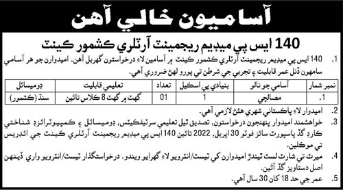 Vacancy Of Masalchi At 140 SP Medium Regiment Kashmore