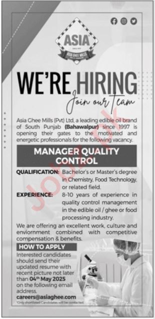 Asia Ghee Mills Pvt Limited Bahawalpur, bahawalpur Punjab Pakistan invites applications from eligible candidates for the post of manager quality control as per advertisement of April 21, 2025 published in daily Jang Newspaper. Bachelor and Master etc. educational qualification will be preferred.