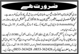 Baluchistan Wheels Limited invites applications for job positions advertised in daily Jang dated 8 October 2023 for following vacancies in Hub, hub Balochistan Pakistan.
