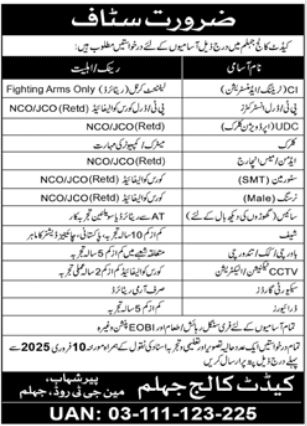 Vacancies in Cadet College Jhelum Advertisement January 2025