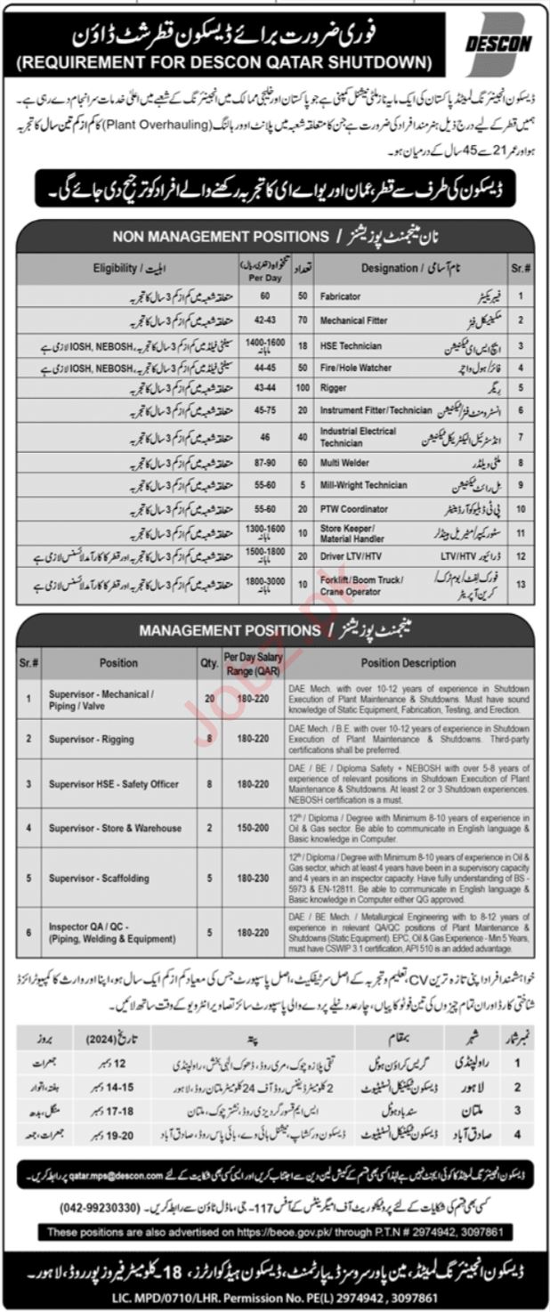 Vacant posts including Assistant Fitter, Multi Welder, Supervisor Piping, Area Engineer, Qc Inspector, Trailer Driver, Area Planner, Supervisor Electrical, Instrument Technician, Fork Lift Operator, Lead Hse, Incharge Mechanical, Supervisor Hse, Qa Lead, Hole Watcher, Crane Operator, Scaffolder, Lead Planning, Electrician, Coordinator Ep, Supervisor Mechanical, Rigger, Foreman Rigging, Fire Watcher, Fabricator, Electrical Technician, Mechanical Fitter, Driver, Lead Rigging, Qc Lead and Lead Mechanical are announced in Descon Engineering Limited Qatar, qatar Qatar as per 8 December 2024 advertisement in daily Jang Newspaper. Persons with Bachelor, Intermediate and DAE etc. education can apply.