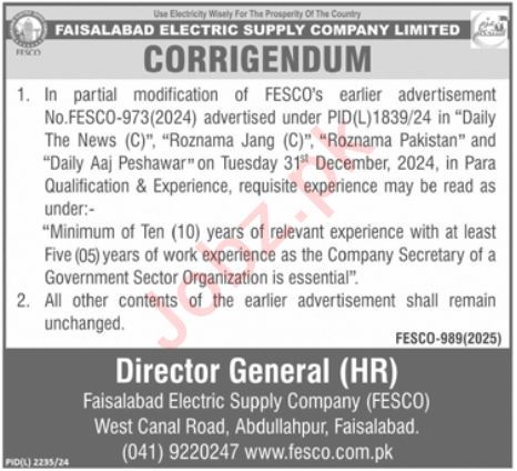 Faisalabad Electric Supply Company Limited FESCO jobs advertisement dated about 9 February 2025 in daily Jang Newspaper invites application for the vacant post of company secretary in Faisalabad, faisalabad Punjab Pakistan. Candidates with Master and Bachelor etc. educational background will be preferred.