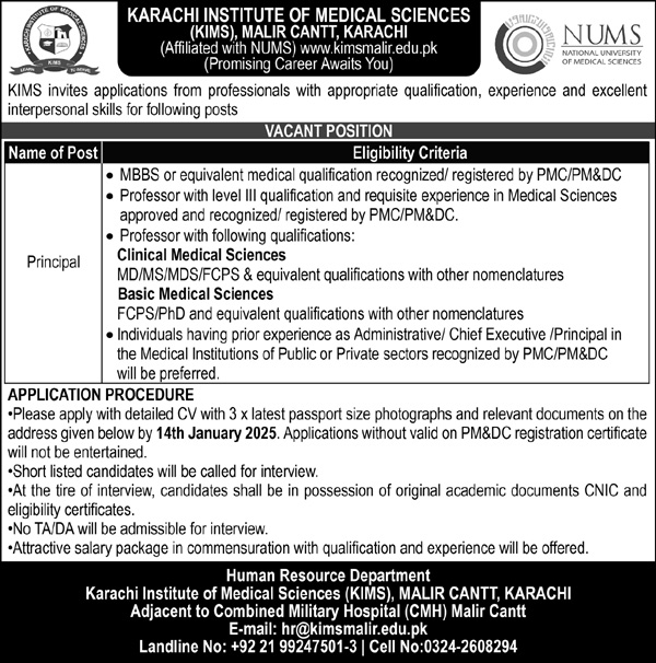 Karachi Institute Of Medical Sciences KIMS jobs advertisement dated about 28 December 2024 in daily Nation Newspaper invites application for the vacant post of principal in Karachi, karachi Sindh Pakistan. MBBS and MS etc. educational qualification will be preferred.