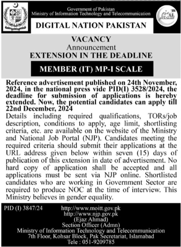 Vacant posts including member it are announced in Ministry of Information Technology & Telecommunication MOIT Islamabad, islamabad Islamabad Pakistan as per 10 December 2024 advertisement in daily Khabrain Newspaper. Persons with Master and Bachelor etc. education can apply.