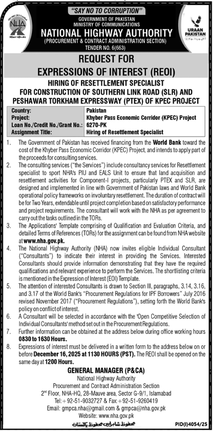 National Highway Authority NHA G-9/1 Islamabad, islamabad Islamabad Pakistan invites applications from eligible candidates for the post of resettlement specialist as per advertisement of November 15, 2025 published in daily Nawaiwaqt Newspaper. Candidates with Bachelor and Master etc. educational background will be preferred.