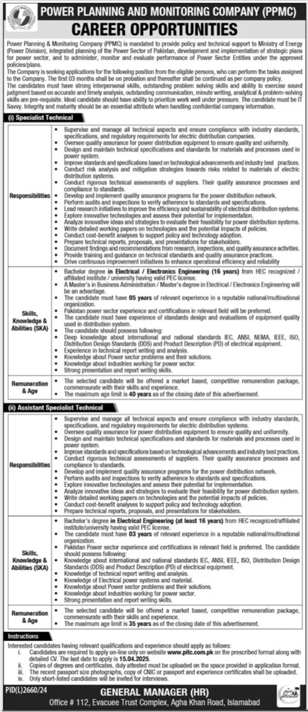 Vacant posts including specialist technical and assistant specialist technical are announced in Power Planning and Monitoring Company Ataturk Avenue Islamabad, islamabad Islamabad Pakistan as per 30 March 2025 advertisement in daily Jang Newspaper. Preferred Education is Bachelor etc.