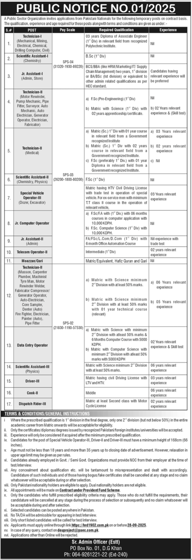 Vacant posts including Scientific Assistant, Special Vehicle Operator, Qari, Cook, Assistant I, Data Entry Operator, Scientific Assistant Ii, Moazzan, Driver Iii, Computer Operator, Assistant Ii, Telecom Operator, Technician Ii, Technician I, Scientific Assistant Iii and Dispatch Rider are announced in Public Sector Organization Dera Ghazi Khan, dera ghazi khan Punjab Pakistan as per 15 September 2025 advertisement in daily Jang Newspaper. Persons with Matric, Middle, Bachelor, BBA, BCS, Intermediate and DAE etc. education can apply.