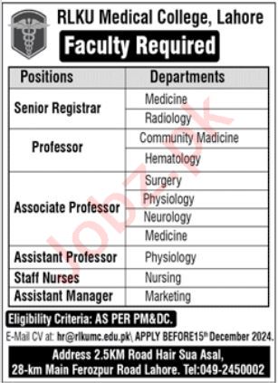 RLKU Medical & Dental College jobs advertisement dated about 15 December 2024 in daily Jang Newspaper invites application for the vacant post of staff nurses, assistant professor, professor, associate professor, assistant manager and sr registrar in Lahore, lahore Punjab Pakistan. Master, MS, Intermediate and Bachelor etc. educational qualification will be preferred.