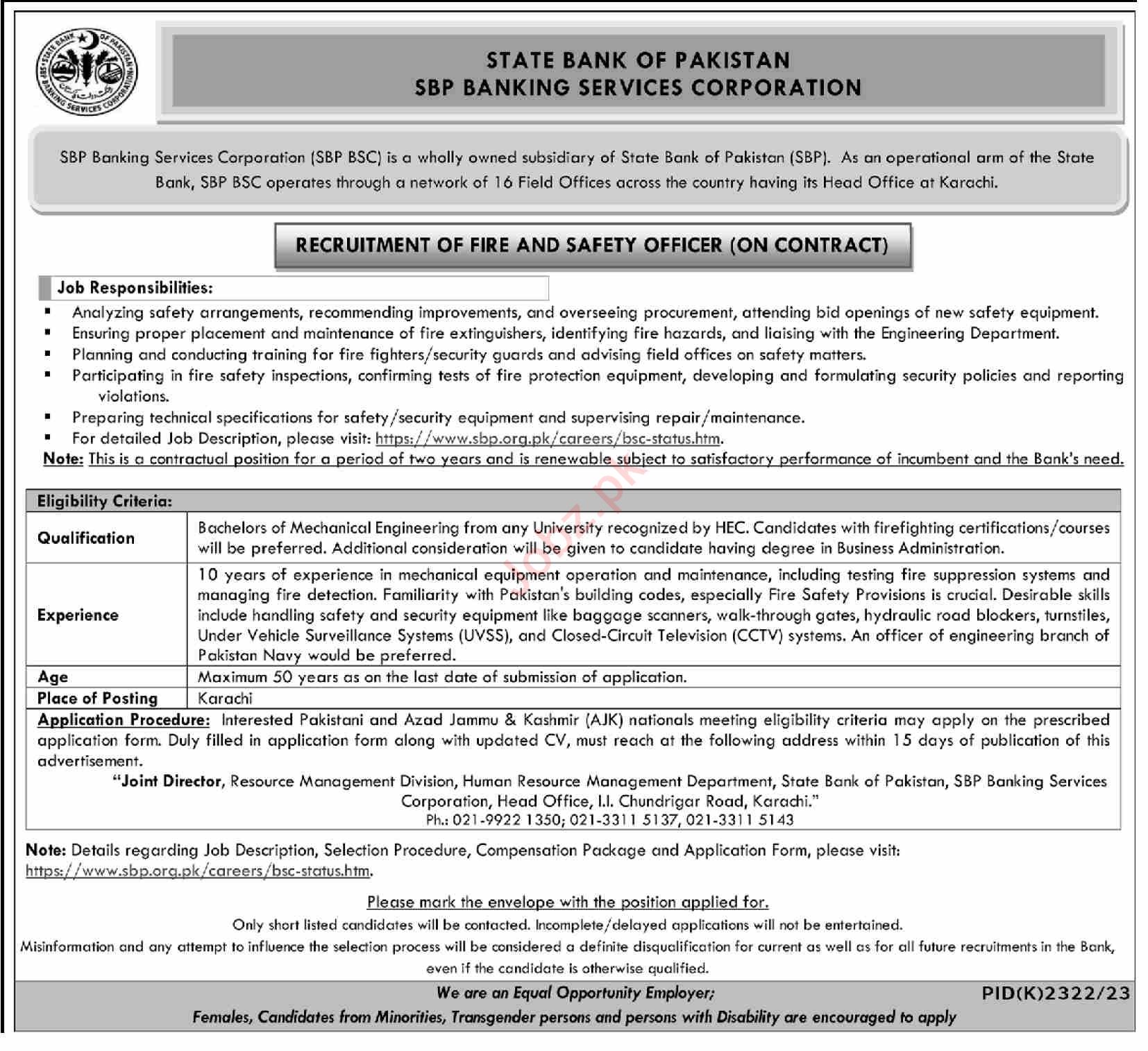 SBP Banking Services Corporation jobs advertisement dated about 18 February 2024 in daily Dawn Newspaper invites application for the vacant post of fire safety officer in Karachi, karachi Sindh Pakistan. Candidates with B.E and Bachelor etc. educational background will be preferred.