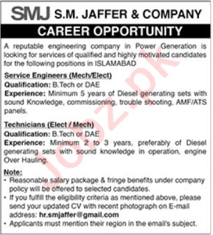 SM Jaffar and Company Islamabad, islamabad Islamabad Pakistan invites applications from eligible candidates for the post of technicians and service engineers as per advertisement of January 12, 2025 published in daily Jang Newspaper. Persons with Bachelor and DAE etc. education can apply.