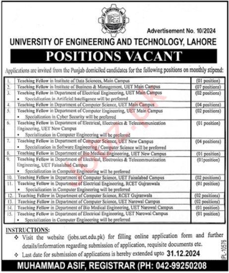 University of Engineering and Technology UET Lahore, lahore Punjab Pakistan invites applications from eligible candidates for the post of teaching fellow as per advertisement of December 15, 2024 published in daily Jang Newspaper. Educational qualifications required Master, MS and Mphil etc.