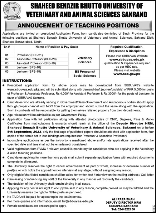 Shaheed Benazir Bhutto University of Veterinary and Animal Sciences jobs advertisement dated about 10 August 2023 in daily Kawish Newspaper invites application for the vacant post of Lecturer Social Sciences, Professor Veterinary Sciences, Associate Professor Veterinary Sciences, Assistant Professor Veterinary Sciences and Lecturer Veterinary Sciences in Sakrand, sakrand Sindh Pakistan. Educational qualifications required Mphil, Phd and MS etc.