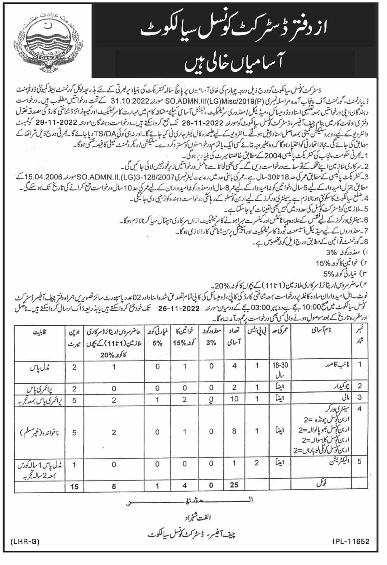 District Council Sialkot, sialkot Punjab Pakistan invites applications from eligible candidates for the post of electrician, chowkidar, mali, sanitary worker and naib qasid as per advertisement of November 14, 2022 published in daily Dawn Newspaper. Preferred Education is Primary and Middle etc.