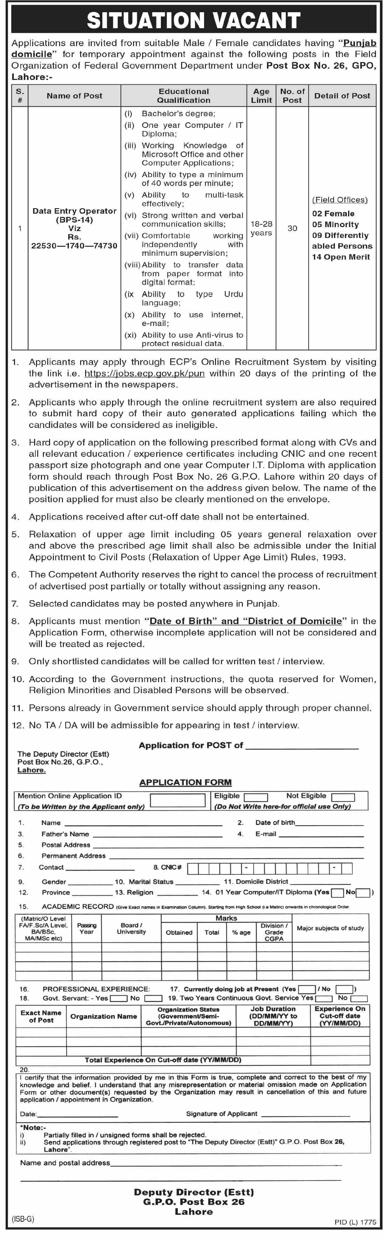 Latest Election Commission of Pakistan ECP Data Entry Posts Lahore 2025