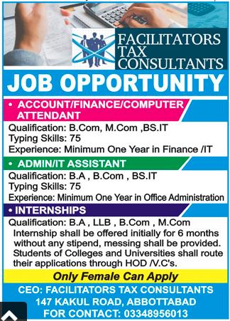 Vacant posts including internship, admin assistant, it assistant, account attendant, finance attendant and computer attendant are announced in Facilitators Tax Consultants Abbottabad, abbottabad Khyber Pakhtunkhwa KPK Pakistan as per 27 December 2024 advertisement in daily Aaj Newspaper. Preferred Education is LLb, BA, BIT, M.com and B.com etc.