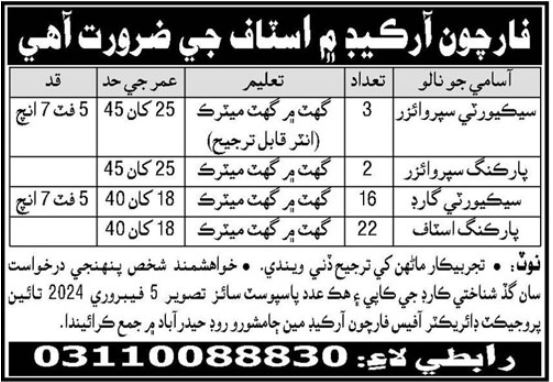 Vacant posts including security guard, parking staff, security supervisor and parking supervisor are announced in Fortune Arcade Hyderabad, hyderabad Sindh Pakistan as per 29 January 2024 advertisement in daily Kawish Newspaper. Persons with Intermediate and Matric etc. education can apply.