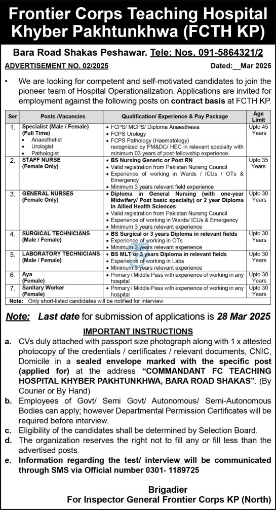 Frontier Corps Teaching Hospital FCTH latest Government Management jobs and others can be applied till 28 March 2025 or as per closing date in newspaper ad. Read complete ad online to know how to apply on latest Frontier Corps Teaching Hospital FCTH job opportunities.