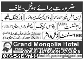 Grand Mongolia Hotel Rawalpindi, rawalpindi Punjab Pakistan invites applications from eligible candidates for the post of house keeping supervisor, dish washer, hr assistant, house keeping, restaurant waiter, front office manager, receptionist and marketing manager as per advertisement of April 28, 2023 published in daily The News Newspaper. Candidates with Intermediate, Middle and Bachelor etc. educational background will be preferred.
