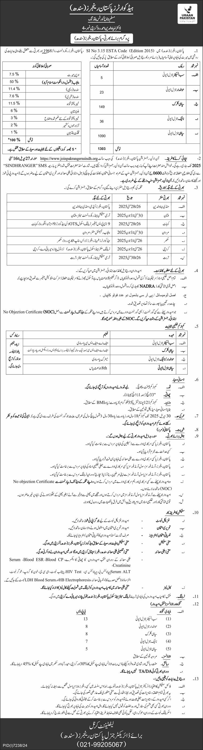 Pakistan Rangers jobs advertisement dated about 26 April 2025 in daily Roznama 92 News Newspaper invites application for the vacant post of nail general duty, sub inspector general duty, sepoy clerk, sepoy general duty and havildar general duty in Karachi, karachi Sindh Pakistan. Intermediate, Matric and Middle etc. educational qualification will be preferred.
