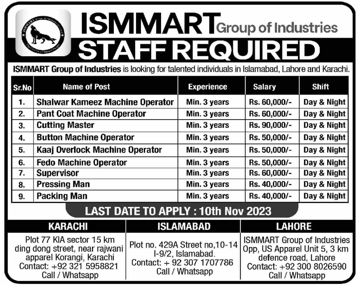 Vacant posts including packing man, cutting master, fedo machine operator, button machine operator, supervisor, kaaj overlock machine operator, shalwar kameez machine operator, pressing man and pant coat machine operator are announced in ISMMART Group of Industries Karachi, lahore, islamabad and karachi Sindh Pakistan as per 31 October 2023 advertisement in daily Dawn Newspaper. Candidates with Bachelor, Intermediate and Matric etc. educational background will be preferred.